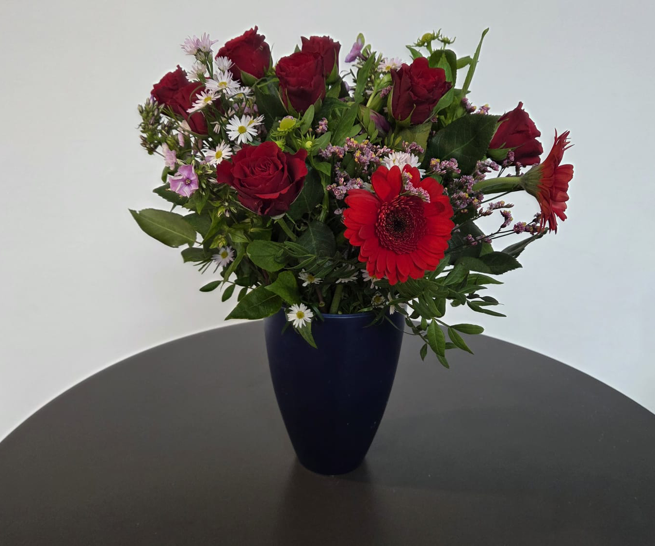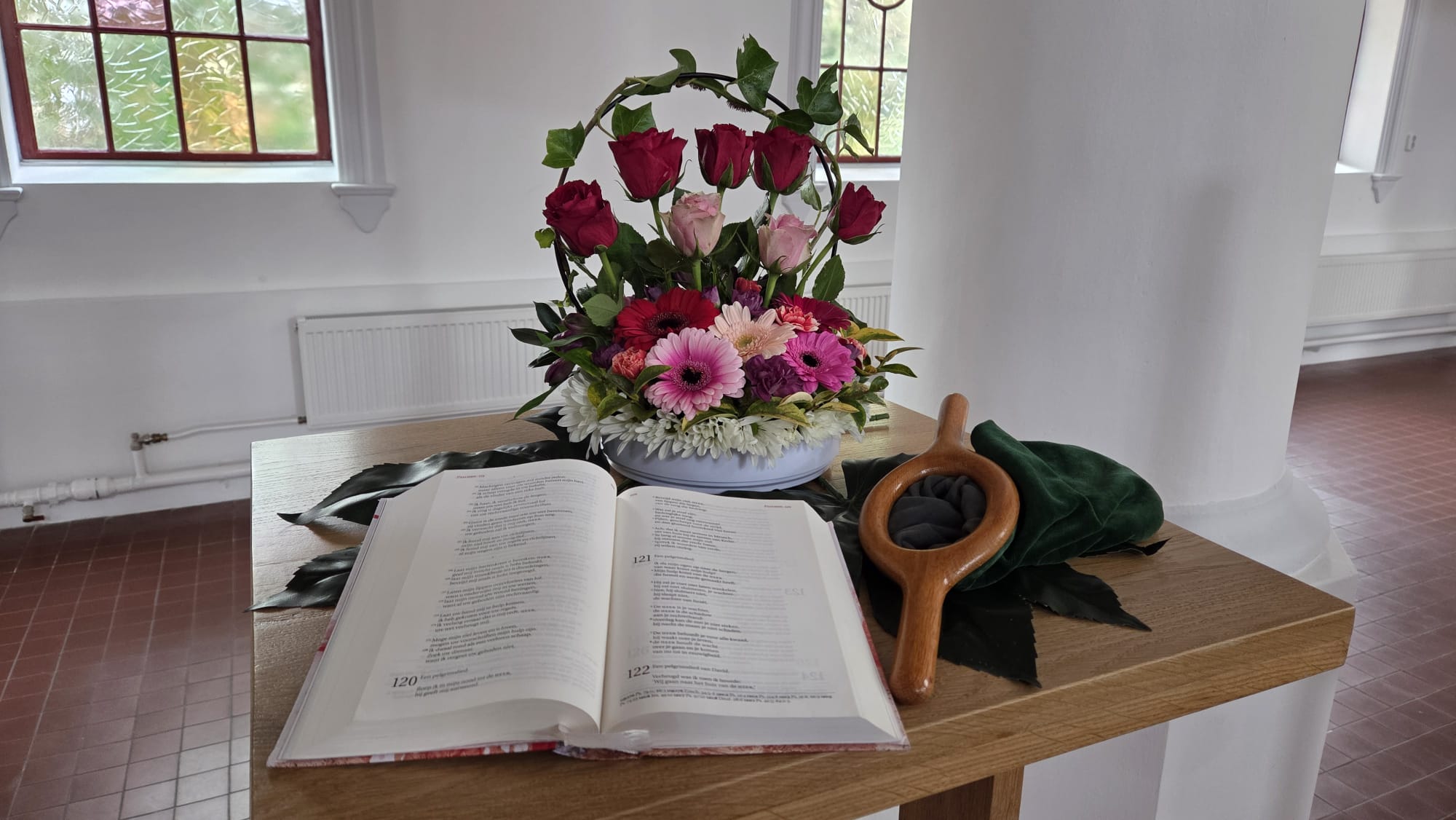![]() Vandaag nemen we afscheid van 2 ambtsdragers, Truus Eising en Sylvia Dijkstra. Het bloemstuk is daar een symbool van. In het stuk zien we rode rozen die symbool staan voor de kerkenraad en 1 andere kleur roos voor de afscheidnemende ambtsdragers. De flesjes, waar de rozen in staan, zijn omwikkeld met een lint, dat de onderlinge verbondenheid weergeeft. De rozen staan ook voor geheimhouding, sub rosa betekent namelijk ‘in vertrouwen’. Er is een ring van klimop omheen waardoor we weten dat God ons altijd trouw blijft. Onderaan het bloemstuk zijn veelkleurige bloemen geplaatst - een veelkleurige gemeente. De roos van de ambtsdragers zakt vanuit de kerkenraad terug de gemeente in. De rand van chrysanten staat voor de dankbaarheid die we als gemeente voelen voor het werk dat Truus en Sylvia voor onze gemeente hebben gedaan. Het stuk staat op twee vingerplantbladen die symbool staan voor Gods dragende handen. Op het rode kleed, de kleur van de Heilige Geest, liggen een collectezak en een Bijbel. De symbolen voor ambtsdragers. ![]() | ||