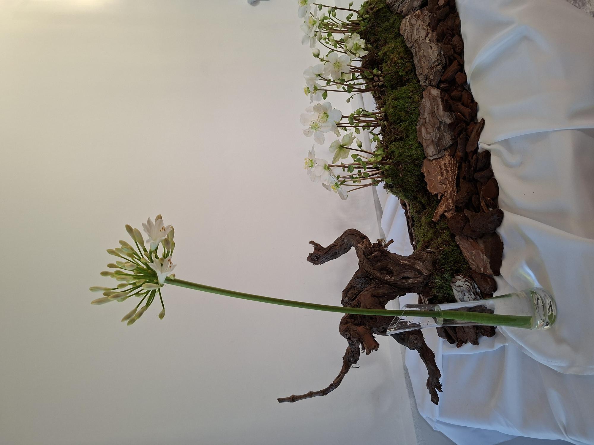 Het mos is symbool voor de moederliefde van Maria die zij voelt voor haar zoon Jezus. Het schors staat voor bescherming, bescherming die Jozes en Maria aan Jezus bieden, maar ook de bescherming die Jezus aan de mens biedt. ![]() De 'Zuid-Afrikaanse lelie' (Agapanthus) staat vooral symbool voor liefde en nieuw beginnen/nieuw leven. Uit liefde voor de mens gaf God zijn eigen zoon, wiens leven als baby begon. Het paarse kleed is vervangen door een wit kleed, kleur van ongereptheid.