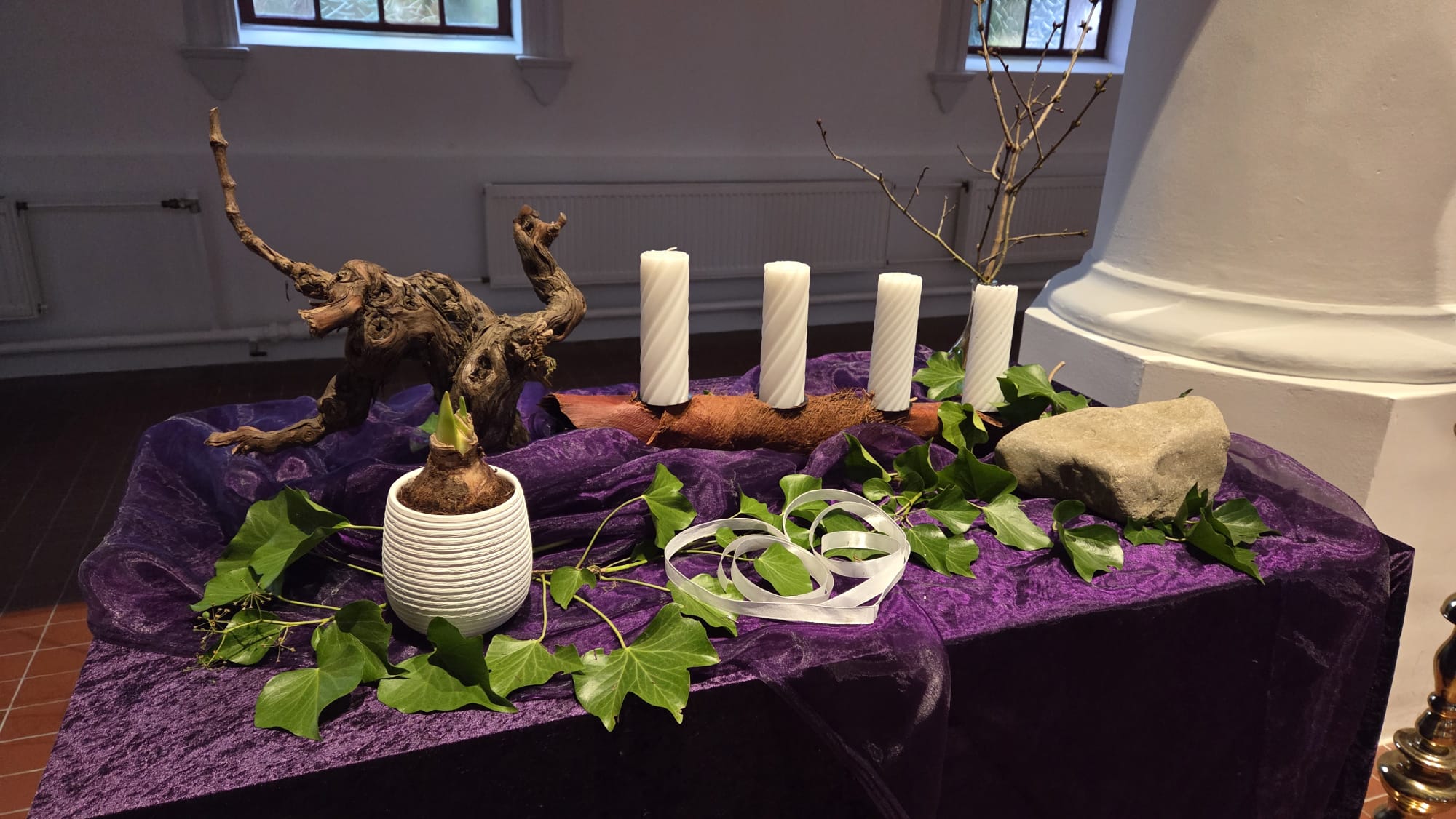 ![]() Algemene uitleg liturgische schikking advent De liturgische schikking voor de komende adventsdagen en kerst heeft een basis van een verticale – (onze verwachting komt van boven) en een horizontale tak. (wij weten ons gedragen) Op de de horizontale tak staan 4 kaarsen. Elke zondag zal er één kaars meer aangestoken worden. Op de tafel ligt een paars kleed ten teken van bezinning en voorbereiding Omdat we door de verschillende gastpredikanten niet altijd de lezingen en thema’s horen die in het kerkelijk jaar beschreven zijn en de kinderen daar in hun kindernevendienst wel aan vasthouden proberen we de thema’s wel steeds met elkaar te verbinden. Het thema tijdens advent voor de kinderen is “De Geluksbezorger.” Tweede zondag van Advent: 07-12-2025 Thema voor de kinderen: Jesaja 11: 1-10: Een prachtkoning Thema van de dienst: Jesaja 11: 1-10 en Lucas 1: 39-45 De lezing van de kinderen en de dienst zijn uit het oude testament gelijk. Jesaja voorziet een rechtvaardige koning uit het geslacht van David die vrede en gerechtigheid zal brengen, waarbij zelfs de wilde dieren in harmonie met elkaar leven. Daarom staan er nu bij de schikking takken met bloeiknoppen als teken van verwachting van nieuw leven. De verwachting van nieuw leven lezen we ook in Lucas 1: 1-10 waar Maria Elisabeth bezoekt. De amarylusbol symboliseert hun beider zwangerschap. De kinderen hebben het over de nieuwe koning die verwacht wordt. Zij zullen een kroon bij de schikking leggen. Hoewel het kleed onder de schikking paars is liggen er ook witte linten bij de schikking. Dit omdat wit de kleur van feest is en we in deze dienst ook de huwelijksbevestiging mogen vieren van Anneke en Jeroen. Geraakt door de ander
