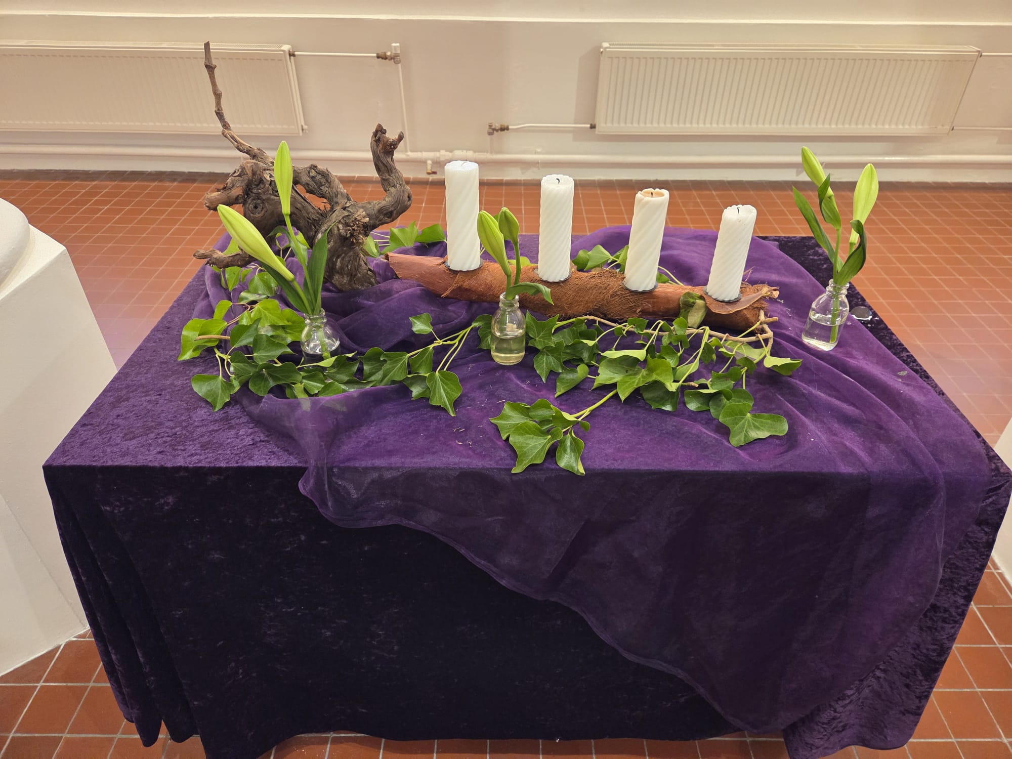 Ook dit jaar zorgde de Bloemengroep voor bijzondere bloemschikkingen in de weken voor Pasen, de 40 dagen tijd. Op de tafel stond een steeds dezelfde basis, maar elke week in een andere vorm. |